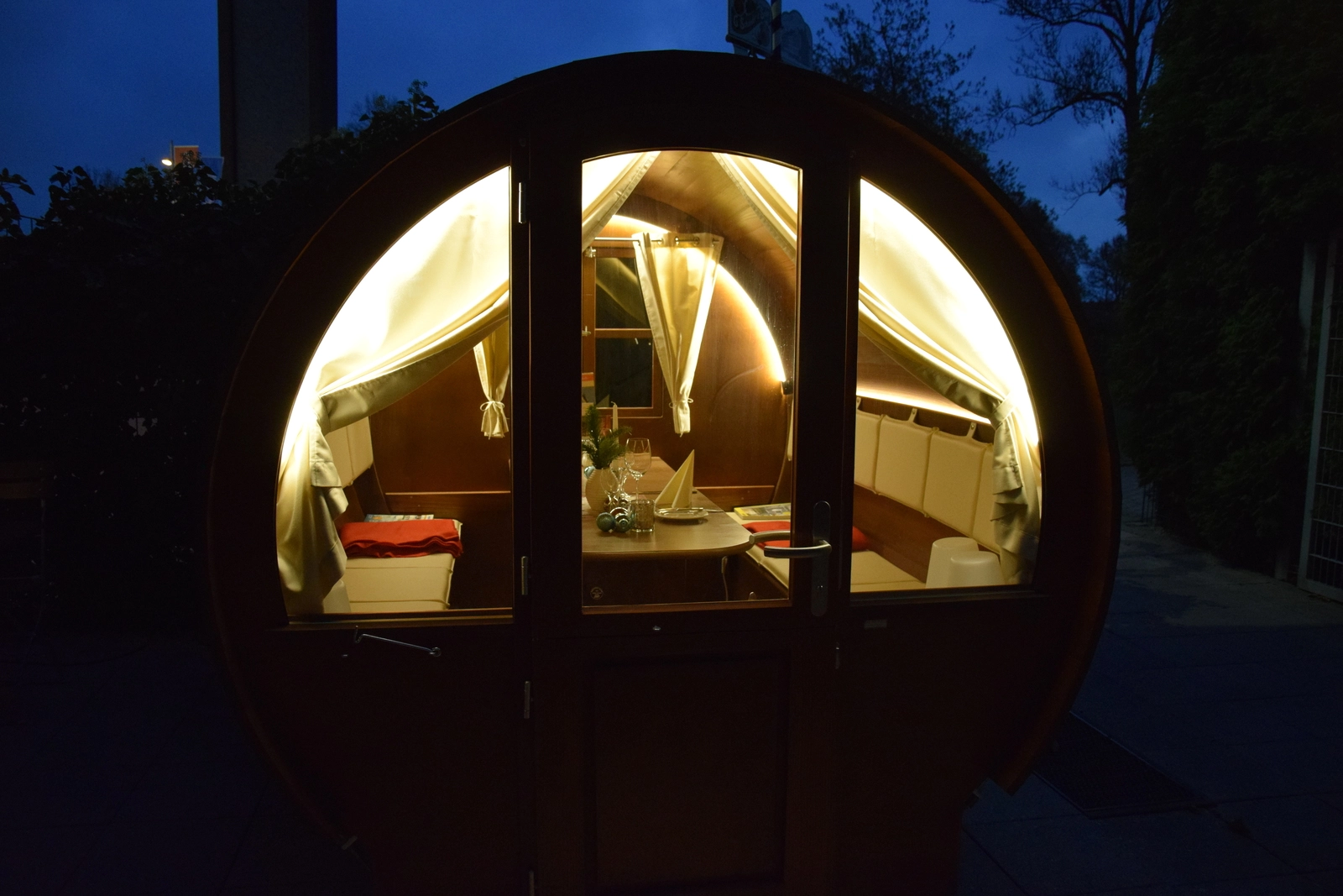 liebevoll dekoriertes Weinfass bietet Platz für bis zu 6 Personen und ist